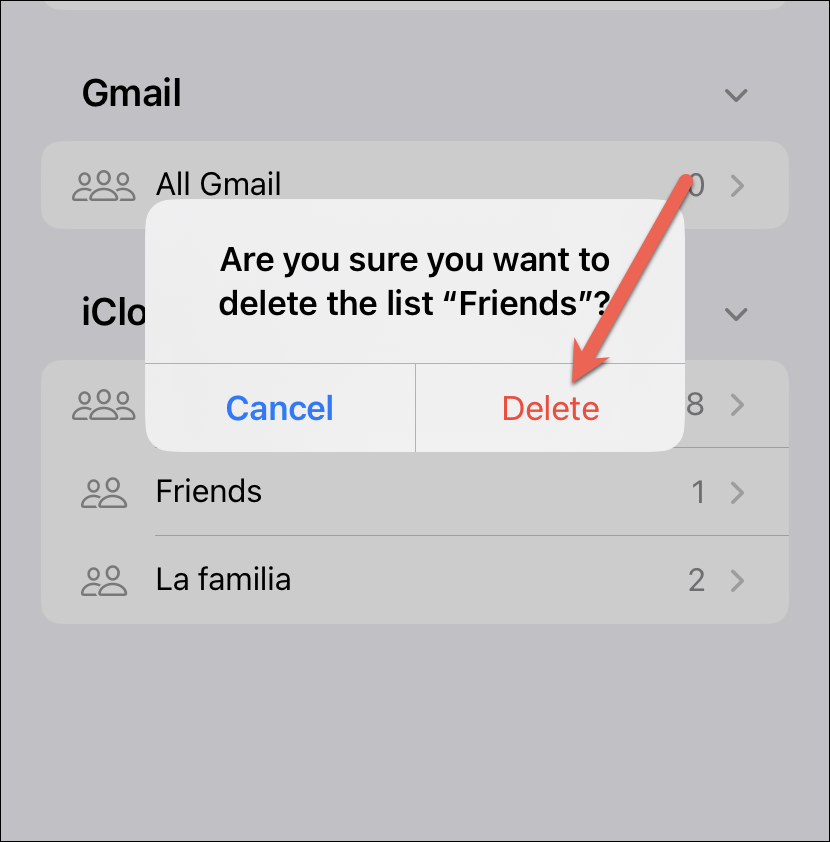 A confirmation prompt will appear. Tap ‘Delete’ from the prompt to remove the list from your contacts.