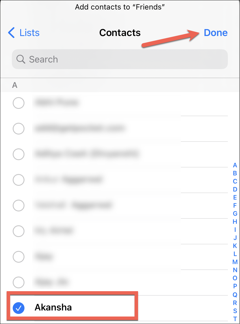 The contacts available in that account will appear. Either use the search bar to search for the contacts you want to add or simply scroll through them. Tap the contacts you want to add to select them. Finally, tap ‘Done’ in the upper-right corner of the screen.