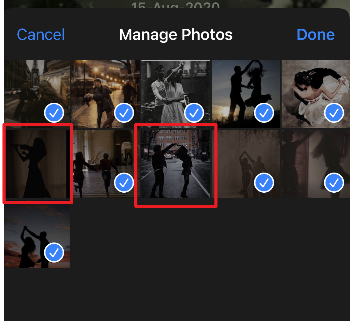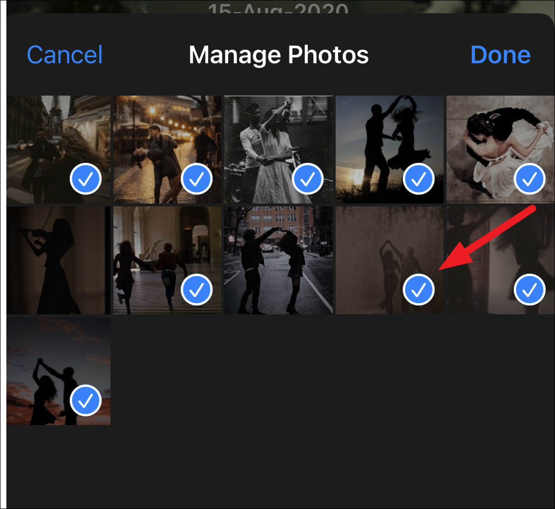 The photos available for the memory will open. The ones already part of the montage will have a blue tick on them. Tap the photo you want to delete to deselect it. Then, tap ‘Done’.