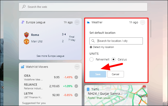 Search for your location or allow Windows to detect it automatically. Choose your preferred units for temperature (Celsius or Fahrenheit), then click 'Save' at the bottom.