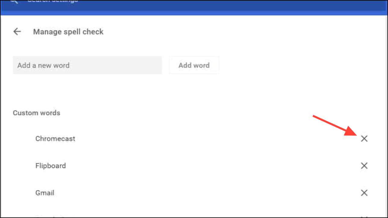 Step 2: To remove a word, locate it in the list and click the X next to that entry. This instantly deletes the word from your custom dictionary, so Chrome will once again flag it as a typo if misspelled in future writing.