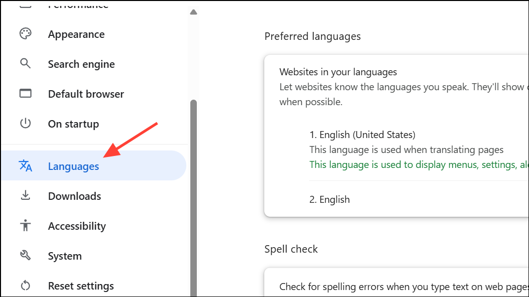 Step 3: In the “Languages” section, click Spell check or Language and input settings (wording may differ based on your Chrome version).