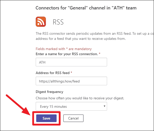 Step 6: Adjust the frequency at which Microsoft Teams checks the RSS feed for updates. If the feed contains critical information, you may prefer to set the update interval to every 15 minutes instead of the default 6 hours. This ensures your team receives the latest updates promptly.