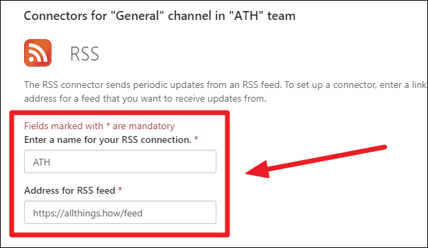 Step 5: The RSS connector configuration screen will appear. Here, input a name for your RSS feed in the provided field. In the Address field, enter the URL of the RSS feed you wish to add to the channel.