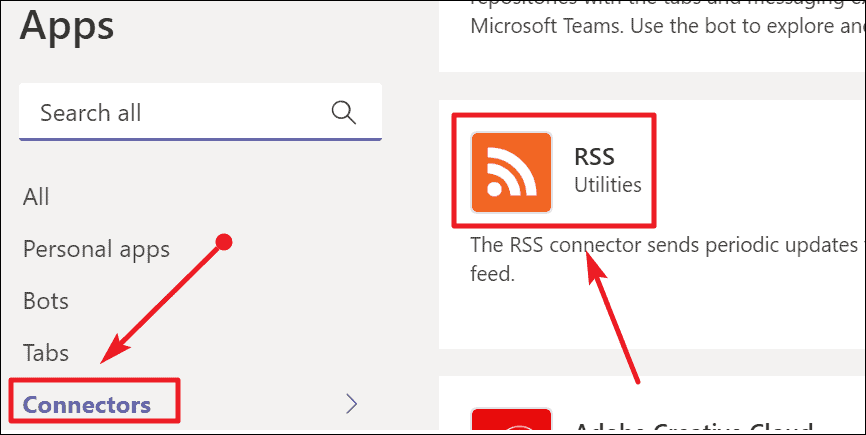Step 2: In the Apps window, select Connectors from the left sidebar. On the right pane, you'll see a list of available connectors. Scroll through the list and find the RSS app, then click on it.