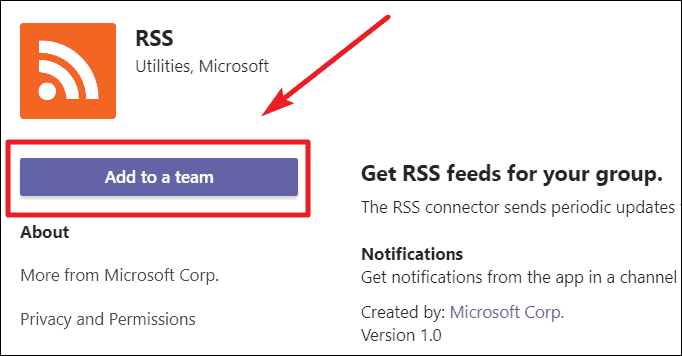 Step 3: A dialog box for the RSS app will appear. Click on the Add to a team button to proceed.