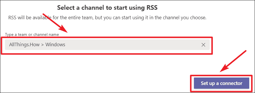 Step 4: In the next screen, you'll need to choose the team or channel where you want to add the RSS feed. In the Type a team or channel name field, begin typing the name of your desired channel. Select the appropriate channel from the suggestions that appear. Once you've selected the channel, click on the Set up a connector button at the bottom right corner.