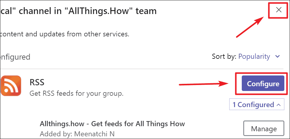 Step 8: After saving, you will be redirected back to the Connectors screen. If you wish to add more RSS feeds to the same channel, click the Configure button next to the RSS app and repeat the process. Otherwise, click the Close button to return to the main Teams interface.