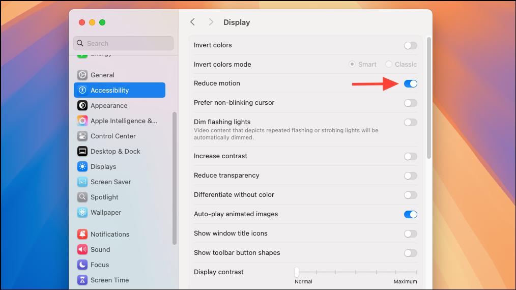 macOS provides an accessibility option to reduce motion effects system-wide. This option disables animations like switching between virtual desktops and opening Mission Control.