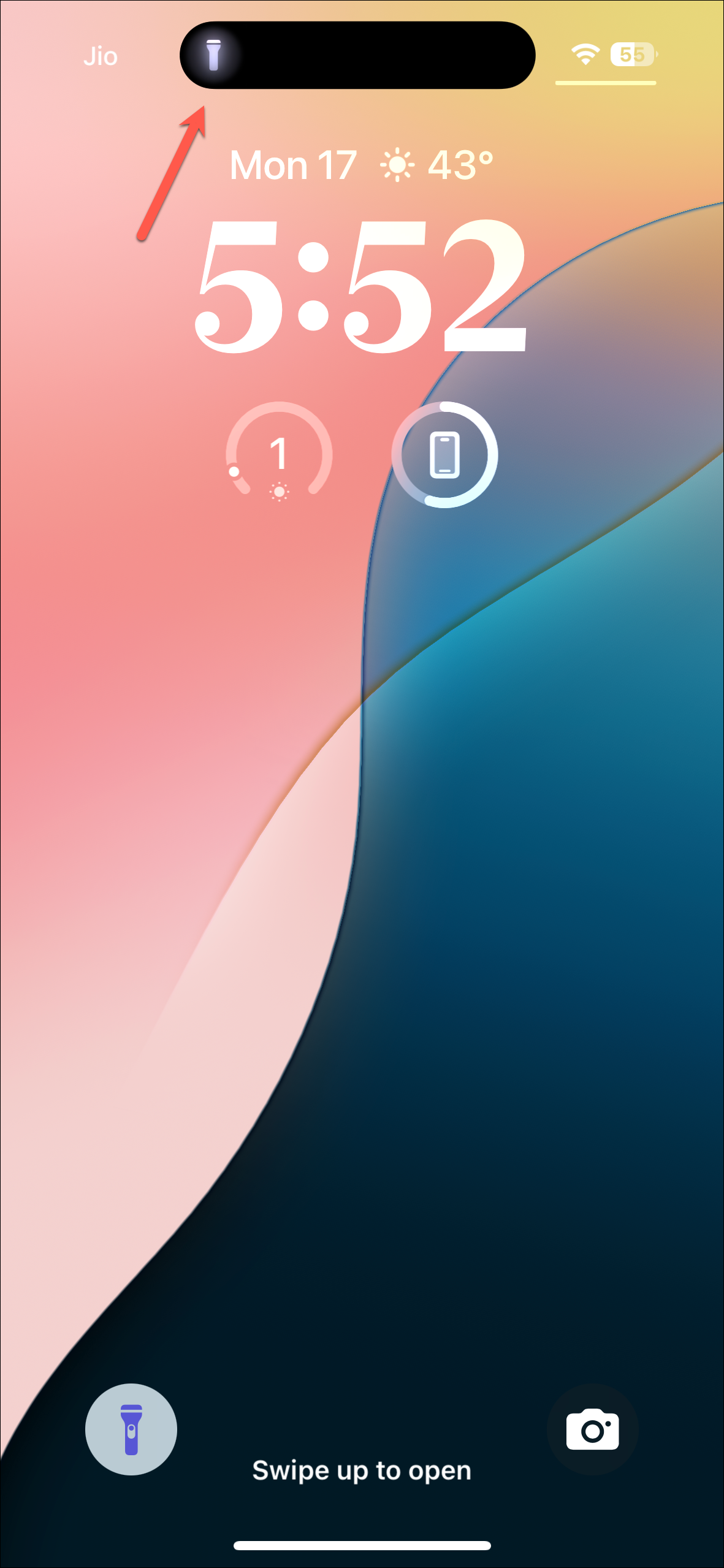 - The control for the flashlight will appear in an expanded view in the Dynamic Island, by default. However, if the Dynamic Island is not expanded, tap on the flashlight part of the island once to expand it.