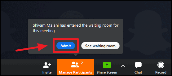 Step 1: When a participant attempts to join your meeting, a notification will appear above the Manage Participants option in the host control bar. You'll have the option to Admit the participant directly or view all waiting participants by clicking on See all participants.