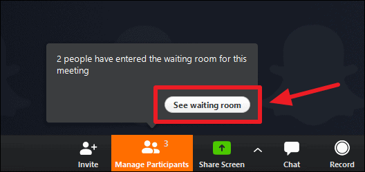 Note: You can also access the waiting room at any time by clicking on the Manage Participants option in the host control bar at the bottom of the Zoom window.