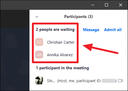 Step 3: Within the Participants panel, you'll see a list under a heading indicating the number of people waiting (e.g., "2 people are waiting"). This section lists all participants awaiting admission.