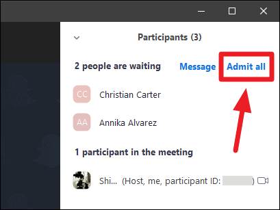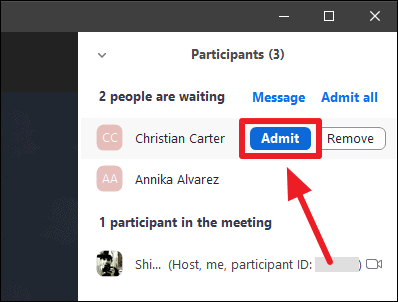 Step 4: To admit a single participant, hover your cursor over their name. An Admit button will appear next to their name; click it to allow them into the meeting.