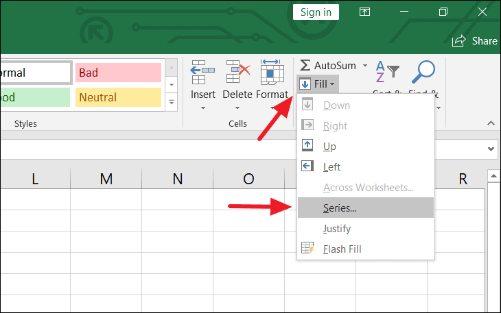 Step 2: Navigate to the Home tab. In the Editing group, click on the Fill option and select Series from the dropdown menu.