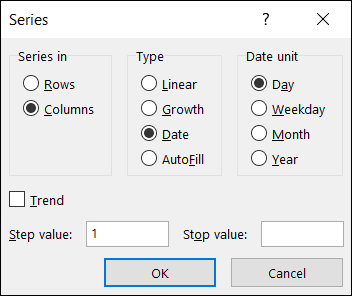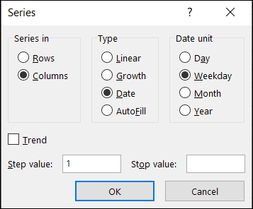 Step 4: In the Series dialog box, choose Date under Type and select the appropriate Date unit (e.g., Day, Weekday, Month, or Year). Enter the Step value based on how you want the dates to increment. Click OK to autofill the dates.