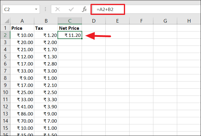 Step 1: Enter the desired formula in the first cell of your target column. For example, input the formula into cell C2.