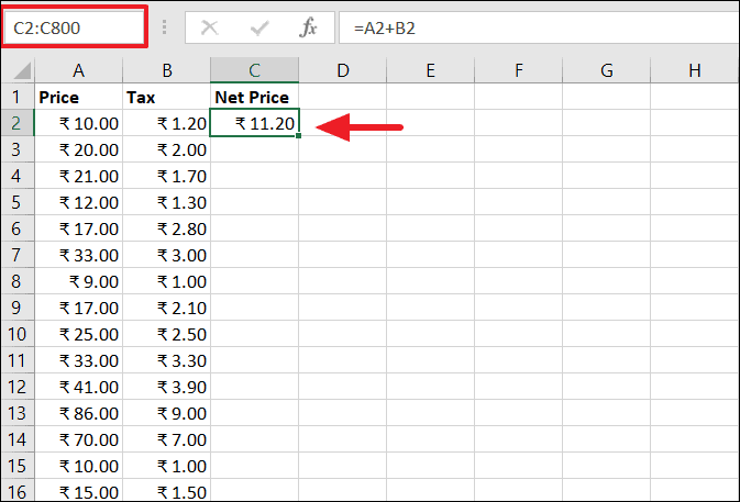 Step 3: Click on the Name Box, located to the left of the formula bar above column A. In the Name Box, type the range where you want to paste the formula (e.g., C2:C800) and press Enter. This action selects the entire specified range.