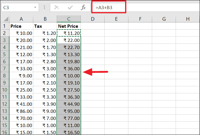 The formula is now applied to all selected cells without the need to drag the fill handle.