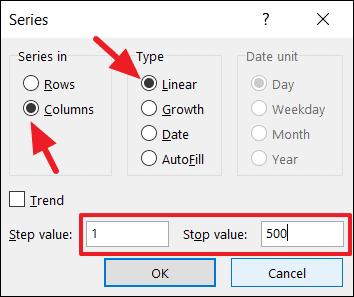 Step 3: In the Series dialog box, select Columns or Rows under Series in, depending on the orientation of your data. Choose Linear as the Type. Enter the Step value (the increment between numbers, e.g., 1) and the Stop value (the ending number of your series, e.g., 500).