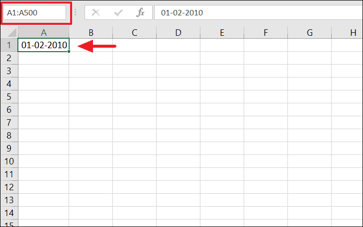 Step 2: Select the range where you want the dates to be filled. To quickly select a large range, click on the Name Box, type the range (e.g., A1:A500), and press Enter.