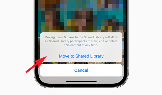 Then, tap on the ‘Move to Shared Library’ option from the overlay menu. This will bring up a further overlay menu; tap on the ‘Move to Shared Library’ option to move the pictures.