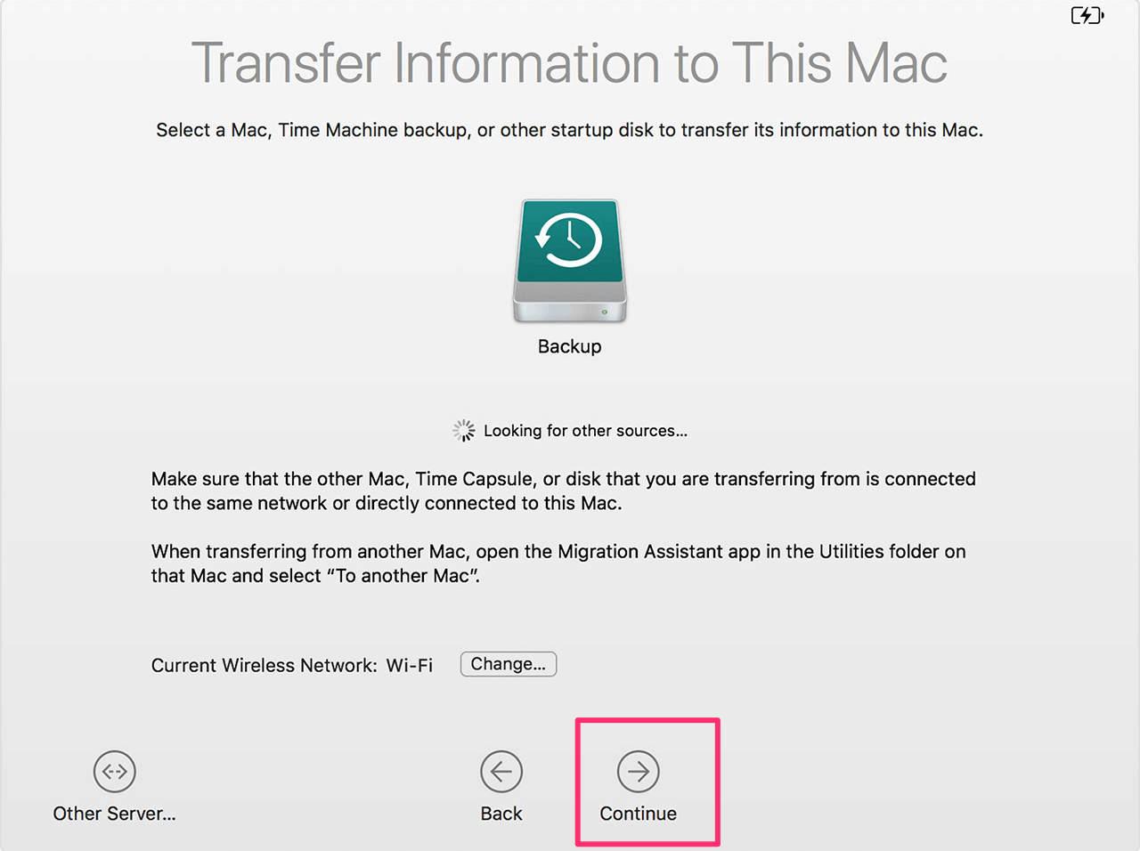 It will automatically detect your Time Machine Backup. Click ‘Continue’ at the bottom to proceed.