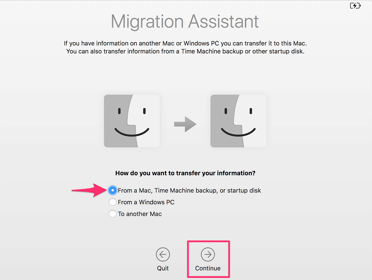 On the Migration Assistant screen, it’ll ask how you want to transfer your data, select the first option to transfer ‘from a Mac, Time Machine backup, or startup disk’ and click ‘Continue’.