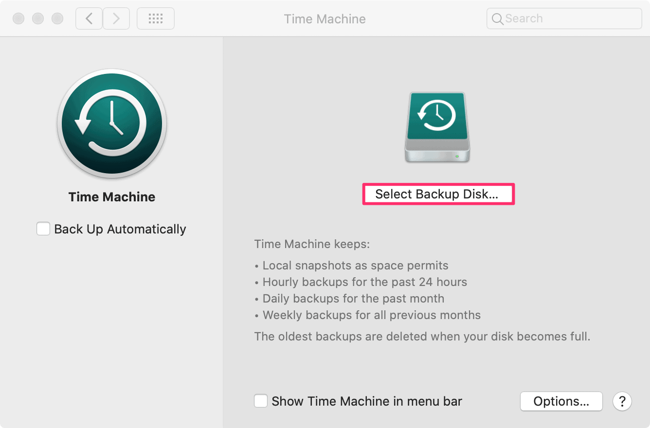 After you select a backup disk, Time Machine immediately begins making backups automatically. You can also turn this feature off by unchecking the tiny box if you want to create manual backups. However, we suggest that you keep it on just in case you forget later on to create a backup.