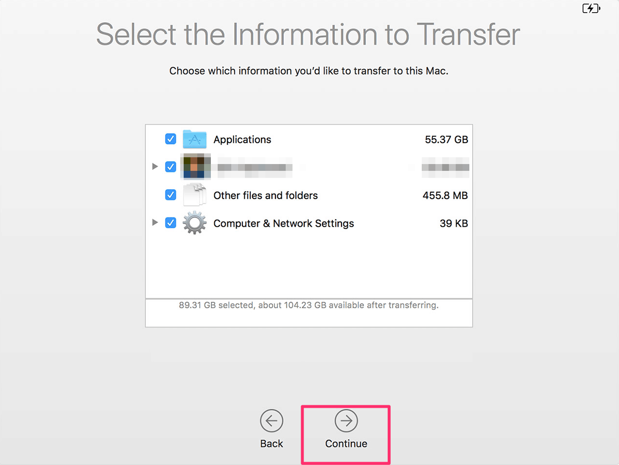 On the next screen, select the data you want to transfer and then click on the ‘Continue’ button again.