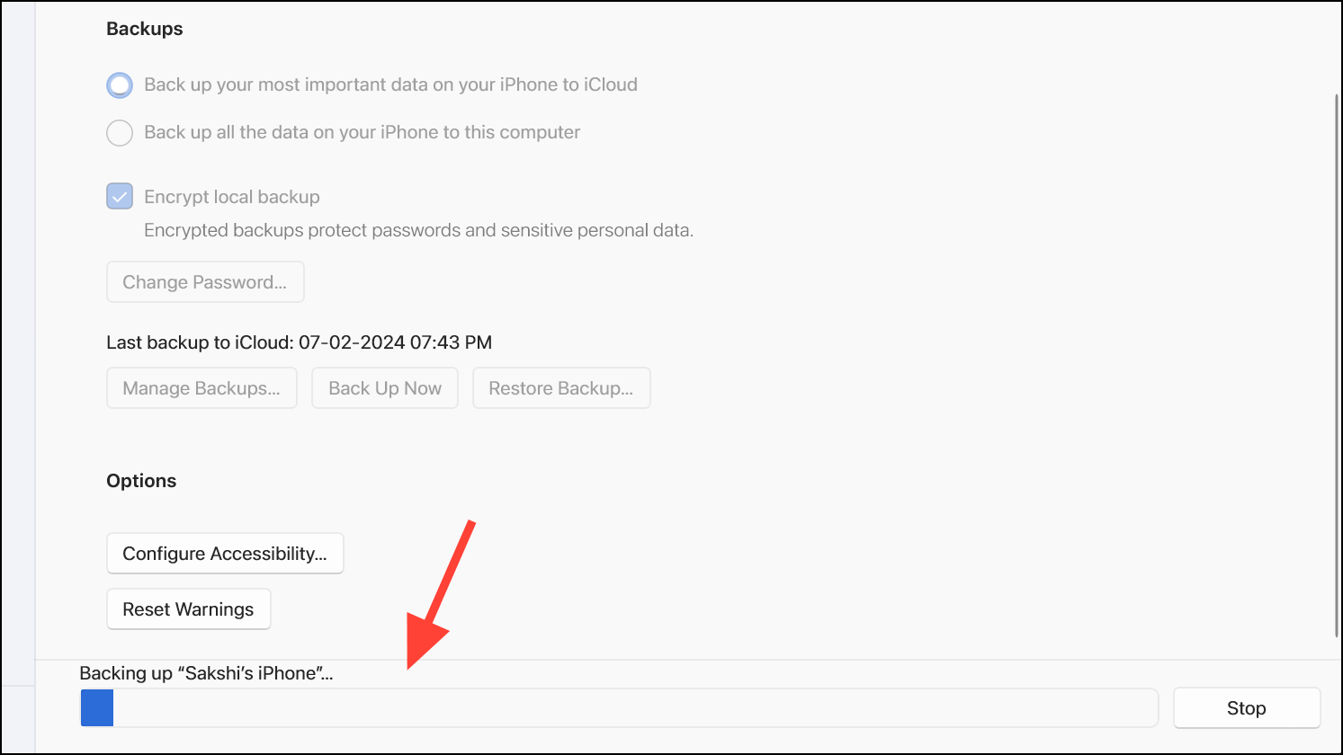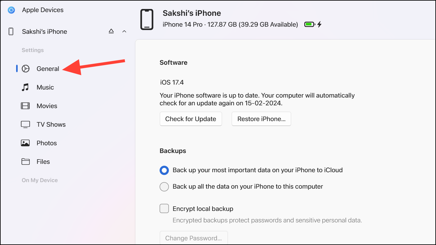 Follow these steps to use the Apple Devices app to take a backup of your iPhone: