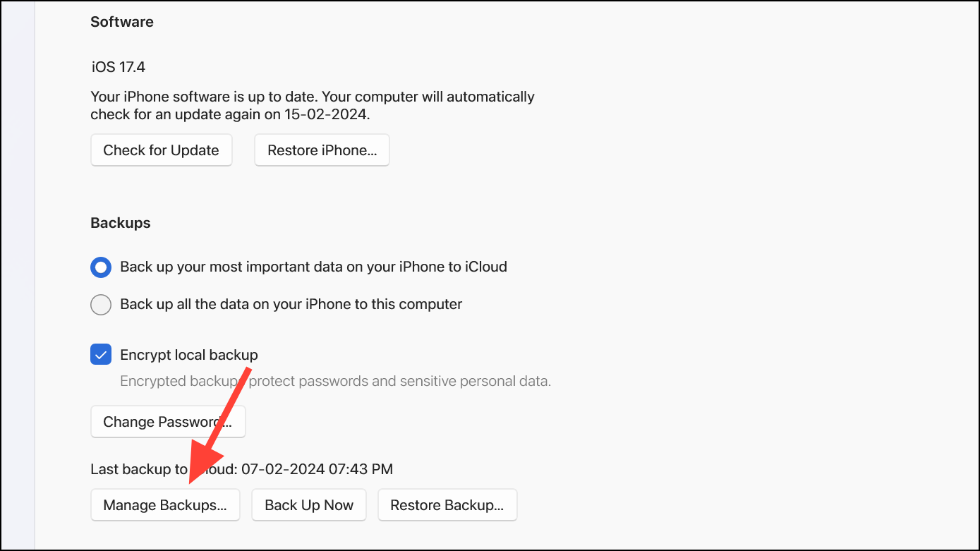 - You can take multiple backups of your iPhone on your computer and choose which backup to use when restoring it. You can also delete previous backups. Click on the 'Manage Backups' button.