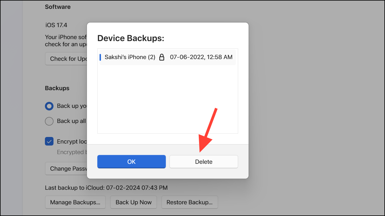 - Your backups, along with the date and time they were taken, will appear. Select a backup and click on the 'Delete' button.