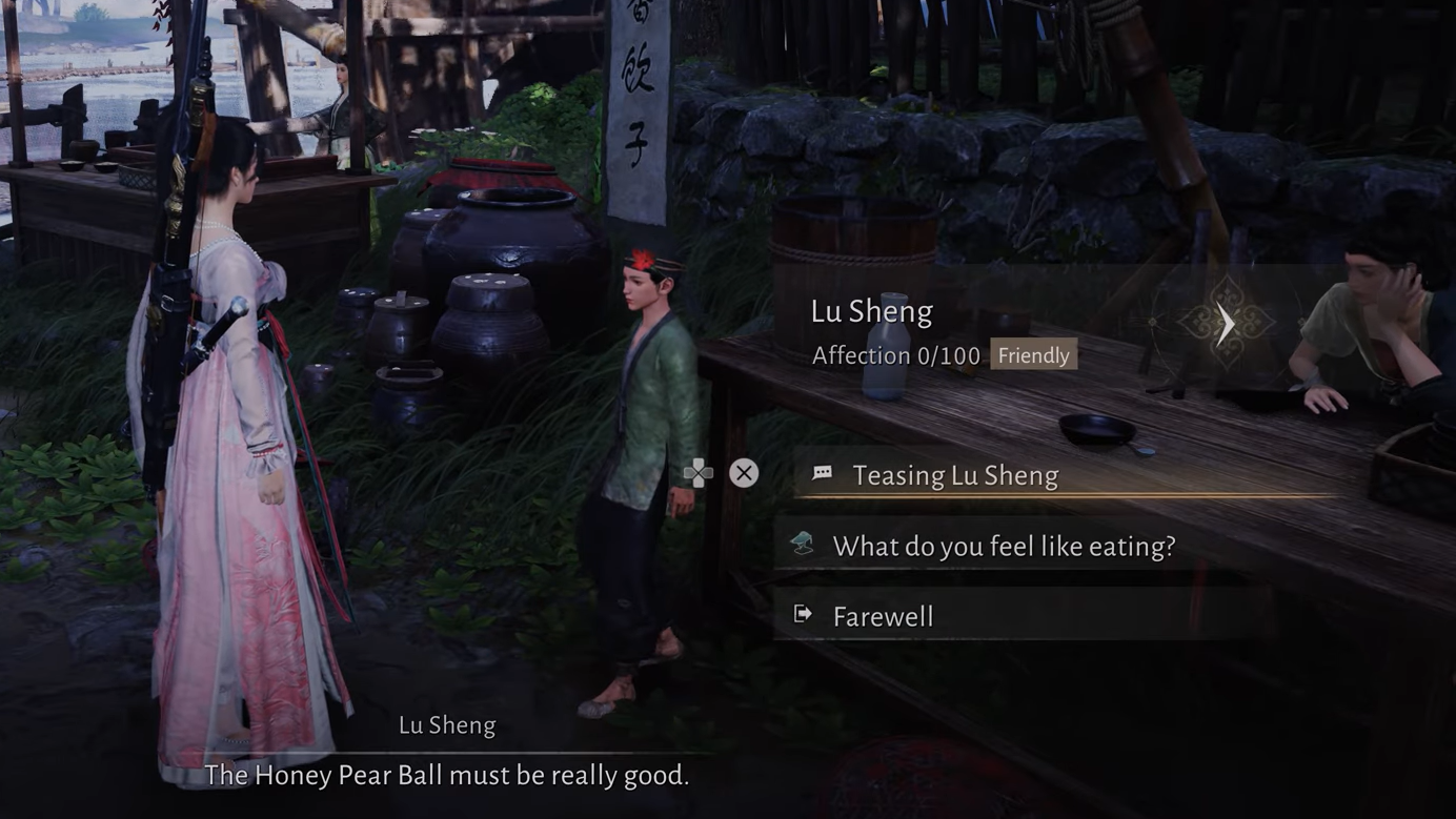Lu Sheng will usually lead by talking about the smell of the Honey Pear Ball and asking if he can have one. The successful path keeps things simple: you confirm he wants to try it, you “buy” it in the roleplay, and you “give” it to him. When it lands, the result can grant a large affection jump and push him to revered status.