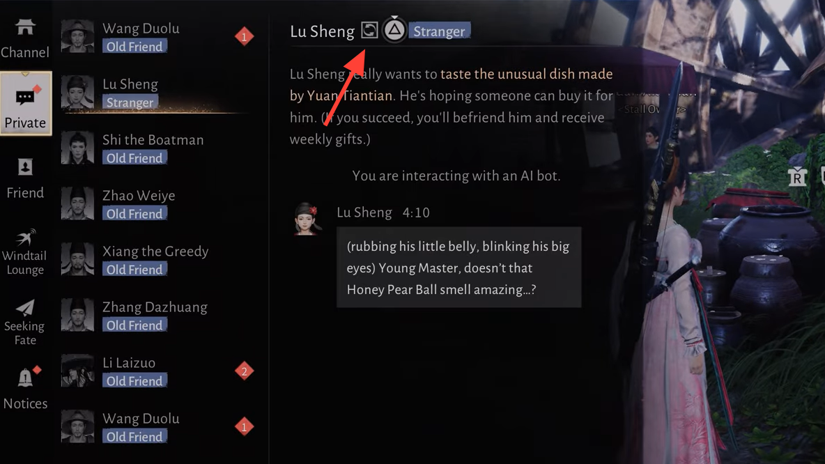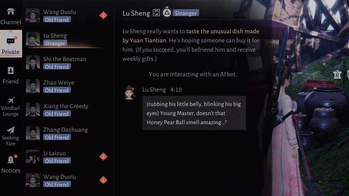 Sometimes the NPC will sound satisfied, but the chat won’t “end” in a way that counts as success. When that happens, check the hint text in the AI Chat UI and push the conversation toward that specific outcome. For Lu Sheng, the end state is straightforward: he gets the unusual dish.