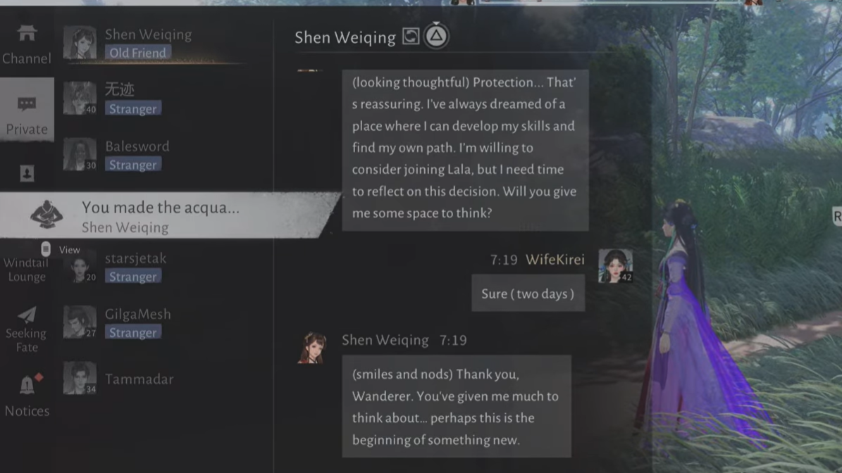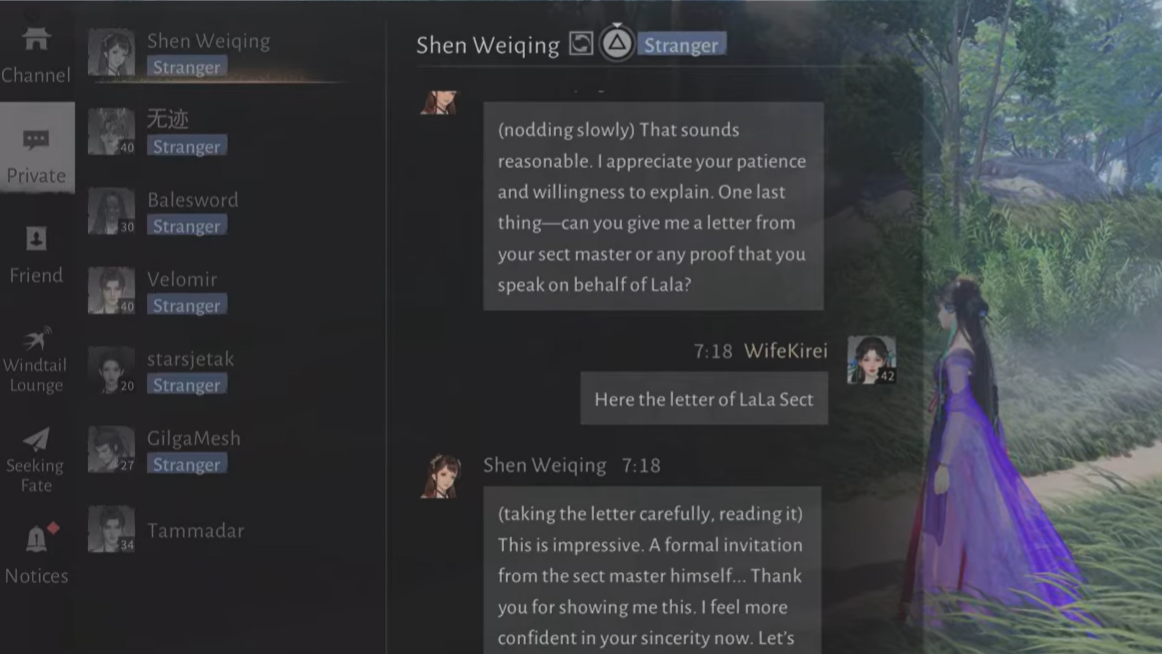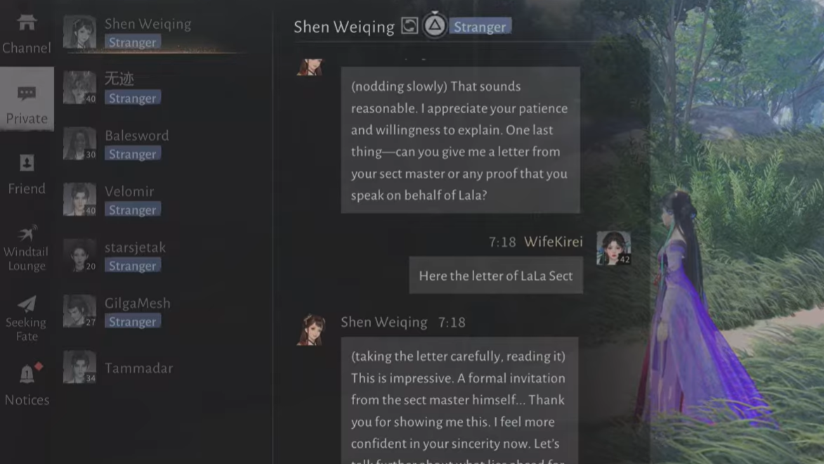 Shen Weiqing’s scenario showcases how Where Winds Meet uses AI chat as a light roleplaying engine. The system responds not only to direct speech but also to narrated actions and time jumps when you wrap them in parentheses.