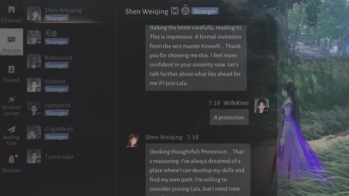 Shen Weiqing is one of the AI chat-powered Jianghu Friends. Instead of preset dialogue choices, you type free-form lines, and her behavior changes based on how well your responses match her hint and personality. The goal is to steer her toward joining a sect that fits her ideals, then lock in the friendship once she commits.