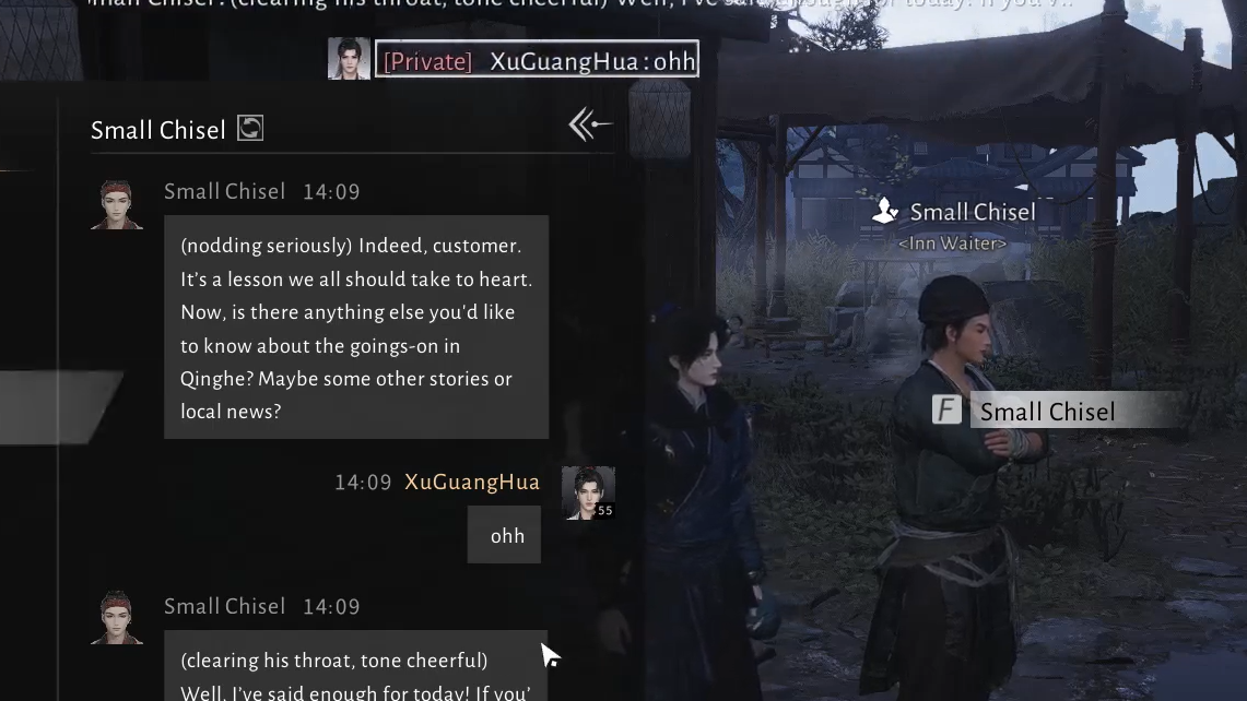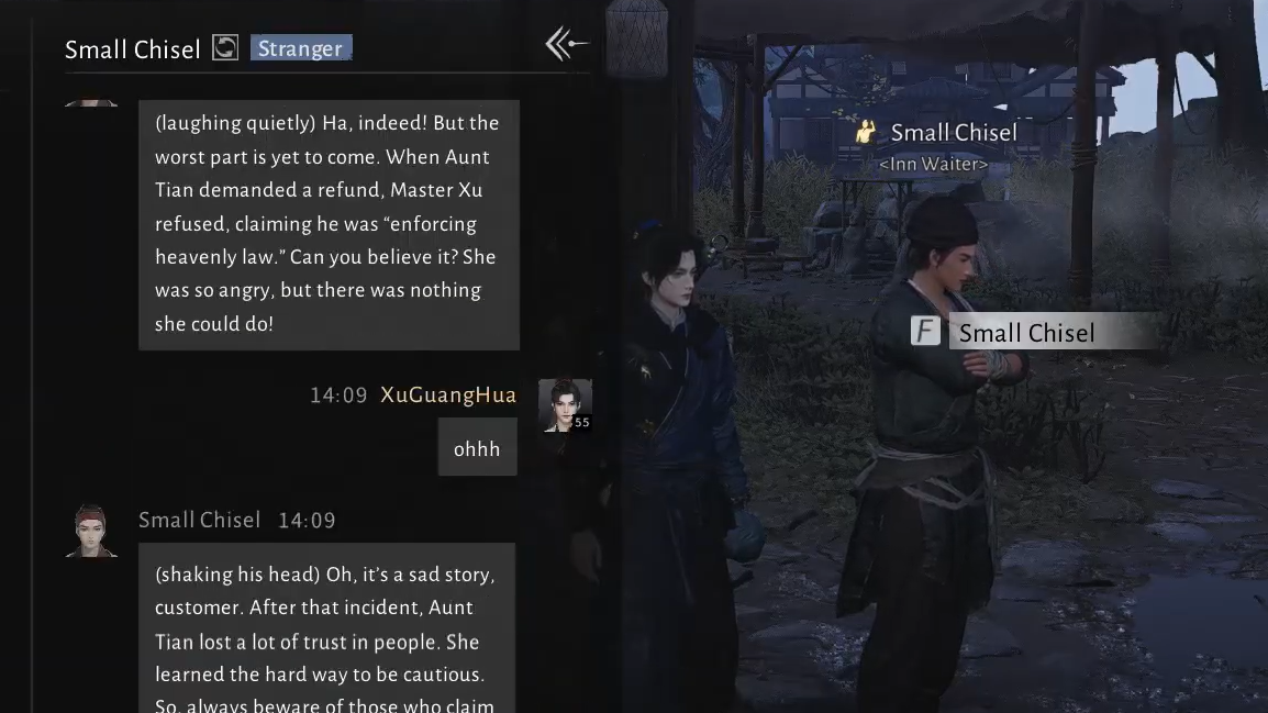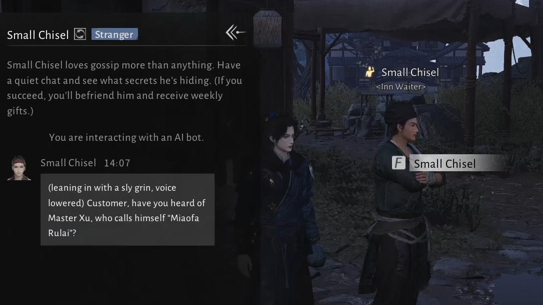 Small Chisel’s friendship is a good entry point into Where Winds Meet’s AI Chat system: the stakes are low, the theme is simple, and success comes from treating him as what he is in the world—an inn waiter who thrives on gossip, eager to swap stories with anyone willing to listen and share.
