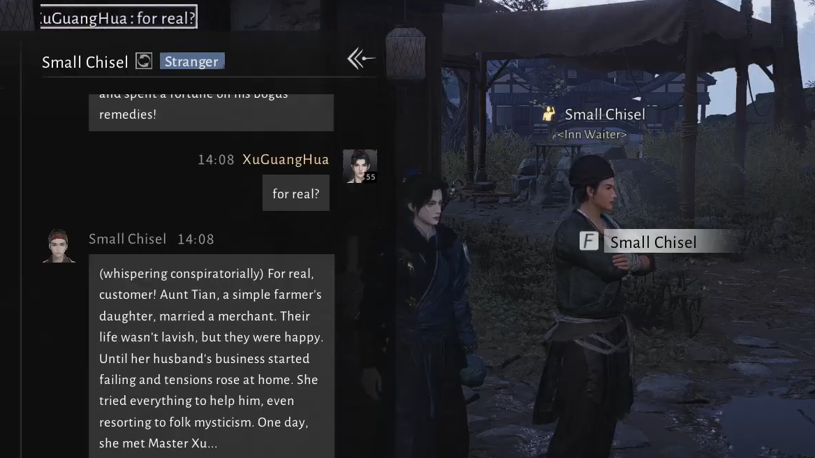 AI Chat NPCs in Where Winds Meet respond not only to plain text but also to stage directions written in parentheses. Small Chisel’s successful example makes use of this: the protagonist “tells” a long story in brackets rather than line-by-line dialogue. That looks like: