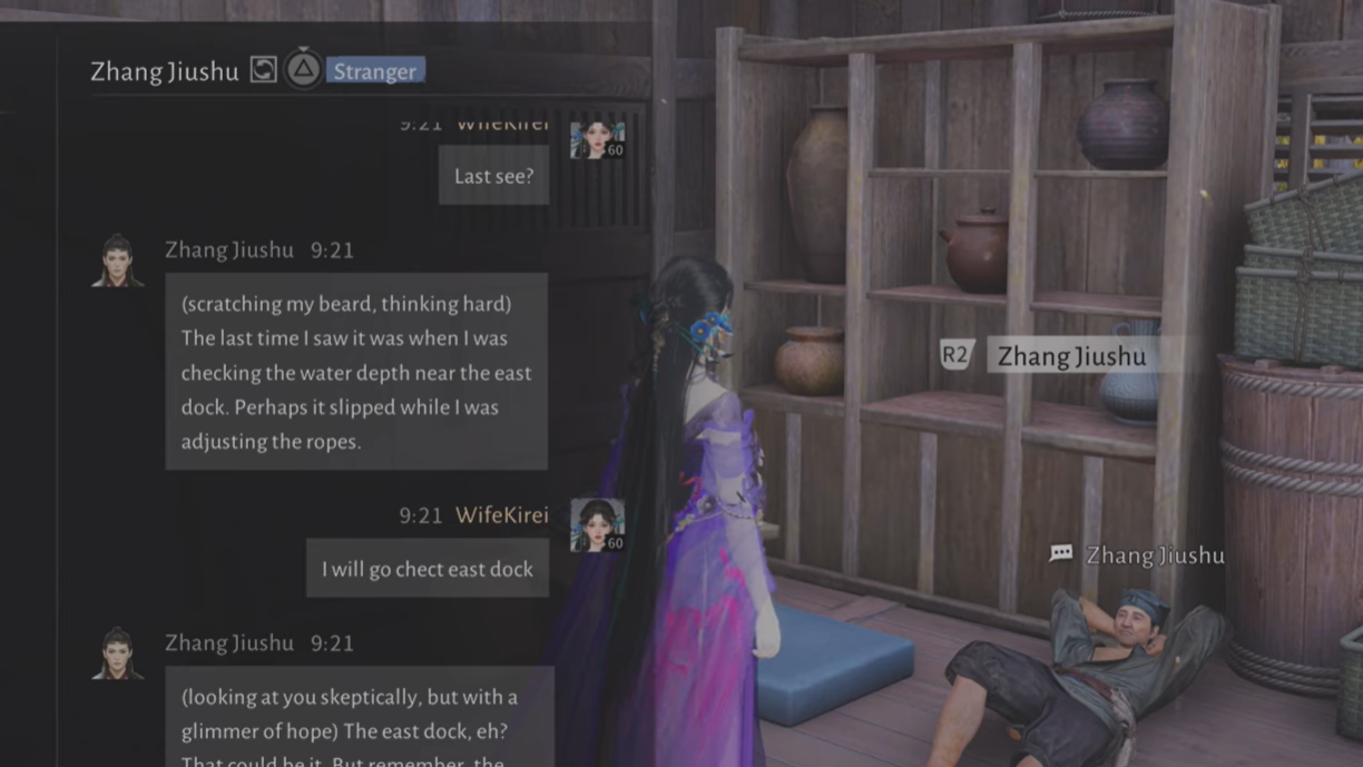 Zhang’s AI Chat revolves around a simple idea: he lost a plummet (a lead weight used for measuring verticals) while working, and you earn his trust by noticing it and returning it.