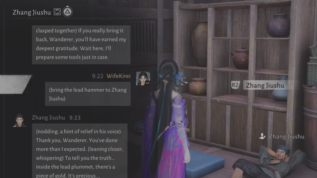Step 2: Paste or type a line that clearly shows him the plummet, for example: (holding up a worn lead hammer) Master Zhang, I came across this while foraging by the fence. Does this look like the plummet you lost?.