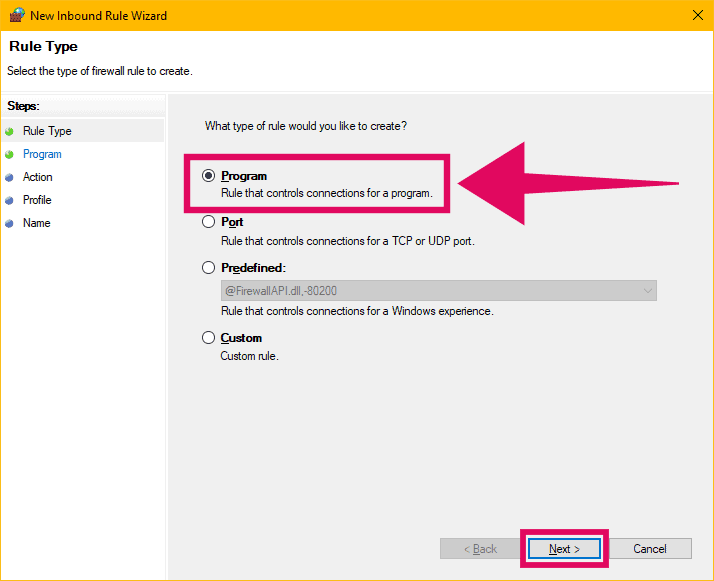 On the “New Inbound Rule Wizard” screen, make sure “Program” option is selected and then click the “Next” button.