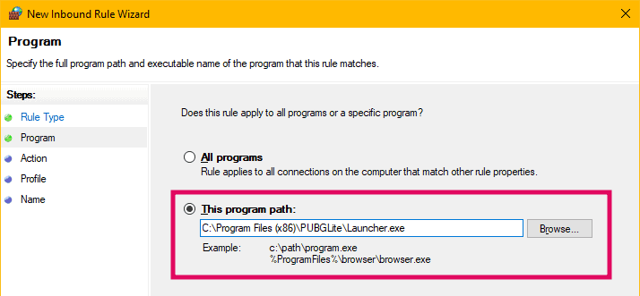 Paste the installation path in the “Program path” field on the inbound rule wizard window, and then hit the Next button.