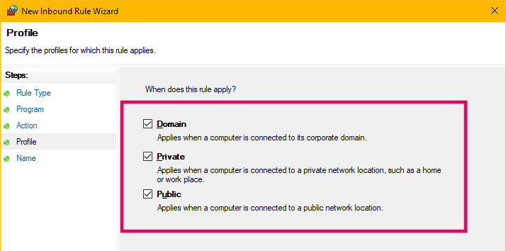The next step “Profile” is very important as it is where you define the applicability of rule you are creating. Since the purpose of this guide is to completely block a program via Firewall, we’ll tick all three checkboxes — Domain, Private and Public.