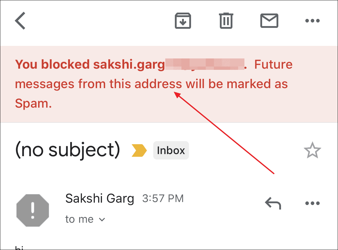 Step 5: After blocking the sender, you'll see a confirmation message at the top of the screen. Future emails from this address will now be marked as spam.