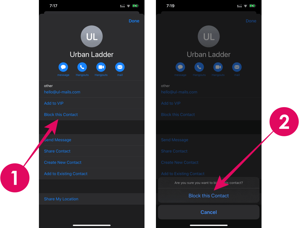 Once the sender’s contact card shows up on the screen, tap the “Block this Contact” option. If you get a confirmation pop-up, tap “Block this Contact” again in the pop-up.