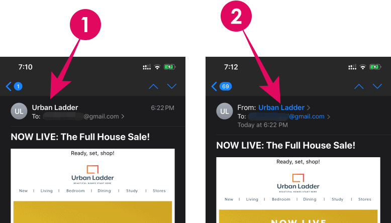 Tap the sender’s name at the top of the mail to expand view, and then tap its contact link next to the “From:” field in the expanded view.