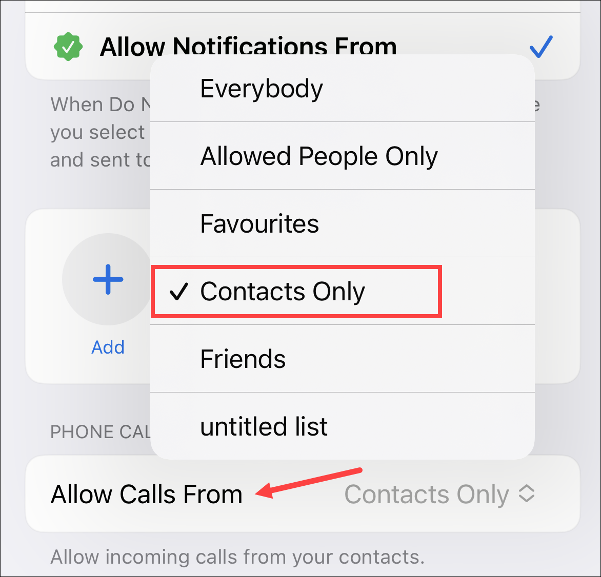 Then, go to the ‘Allow Calls From’ option that just appeared and select ‘Contacts Only’ from the drop-down menu.
