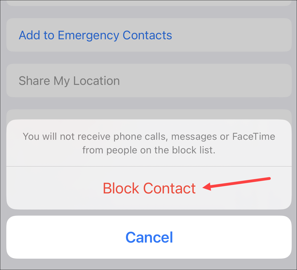 Tap ‘Block Contact’ from the confirmation prompt.