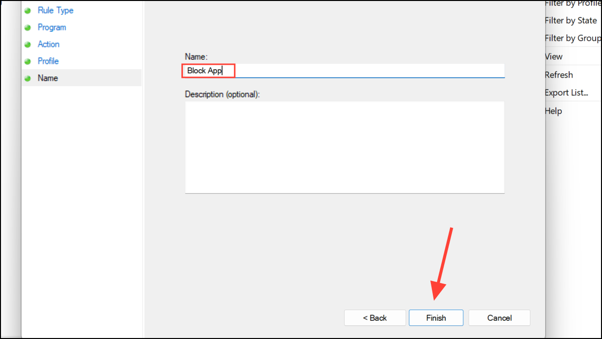 Step 5: Provide a clear, descriptive name for the rule (such as "Block [Application Name] Internet Access") and click "Finish." The rule is now active, and the selected application can no longer establish outbound connections.
